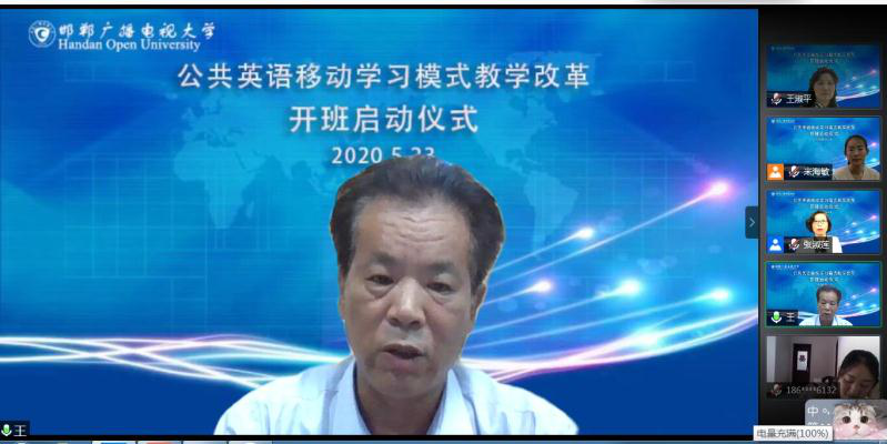 5月23日上午,我校通過騰訊會議在線舉行河北分部公共英語移動學習模式成果推廣試點項目開班啟動儀式。校黨委常委、副校長郭立志,國家開放大學國際語言文化教學部副部長鄭霽鵬,公共外語教學中心副主任熊英、劉寧,邯鄲廣播電視大學黨委書記、校長李守新,副校長王志安應邀出席啟動儀式。試點項目教學團隊所有成員以及參加試點項目的全體學生參加了啟動儀式。儀式由教學支持部主任張淑蓮教授主持。