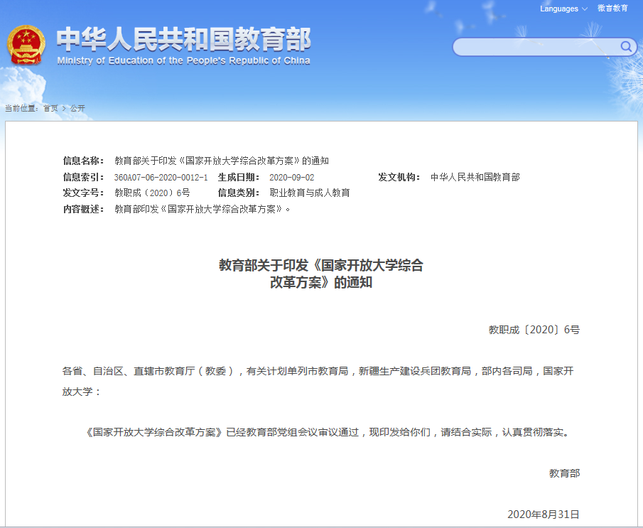 9月7日,教育部官網(wǎng)發(fā)布了關(guān)于印發(fā)《國(guó)家開(kāi)放大學(xué)綜合改革方案》的通知,對(duì)整體推進(jìn)新時(shí)代國(guó)家開(kāi)放大學(xué)轉(zhuǎn)型發(fā)展,提高辦學(xué)質(zhì)量,提升學(xué)校治理體系和治理能力現(xiàn)代化水平提出了相關(guān)要求。