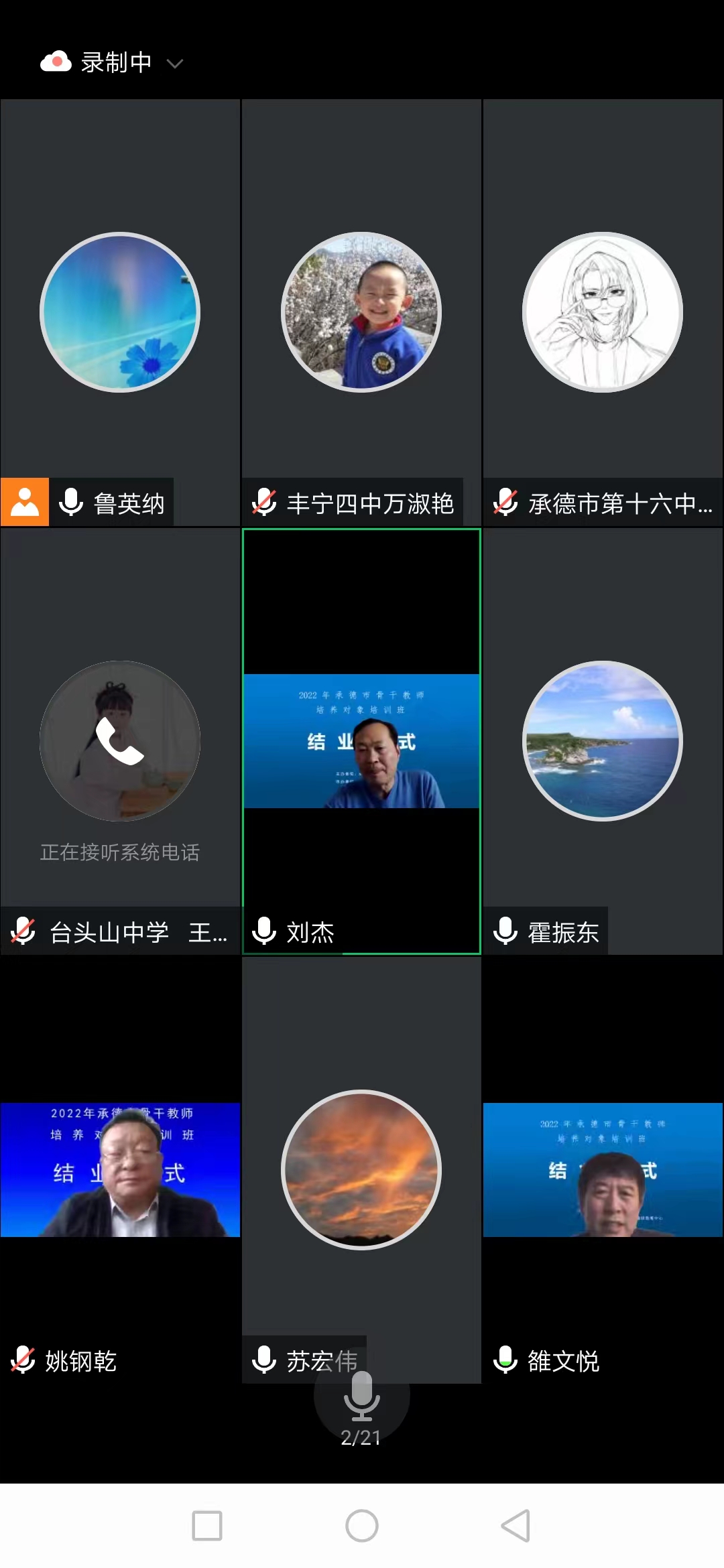 12月13日下午承德開放大學黨委書記姚鋼乾、承德市教育局副局長雒文悅、承德開放大學副校長蘇宏偉、承德市教育局教師工作科科長劉杰、承德市中小學教師繼續教育中心主任霍振東參加了線上的結業儀式。雒文悅局長對培訓工作進行了總結,與學員分享了三點感受,對參訓教師提出四點要求,希望各位老師以“時不我待”的緊迫感,以“舍我其誰”的責任心,點亮星星火,形成燎原勢。勇挑重擔、腳踏實地、砥礪前行。積小勝、成偉業,開創教育事業高質量發展的美好明天。