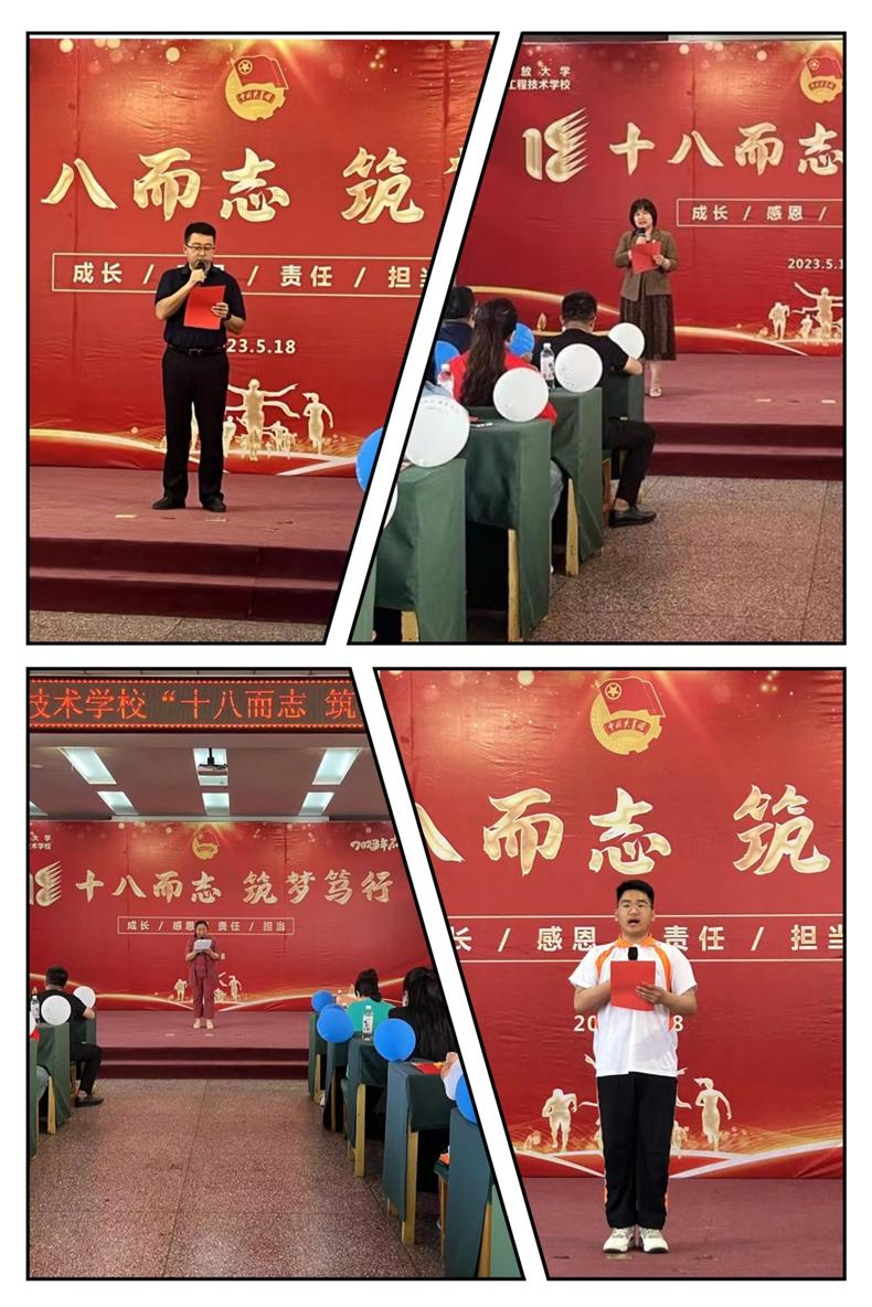 儀式以“十八而志 筑夢篤行”為主題,以校領導寄語,師長致辭,冠戴成人帽、佩戴成人胸章,學生成人心聲,詩朗誦《青春》,感恩父母,手語表演《感恩的心》,成人宣誓,跨“成人門”十個環節,完成儀式。
