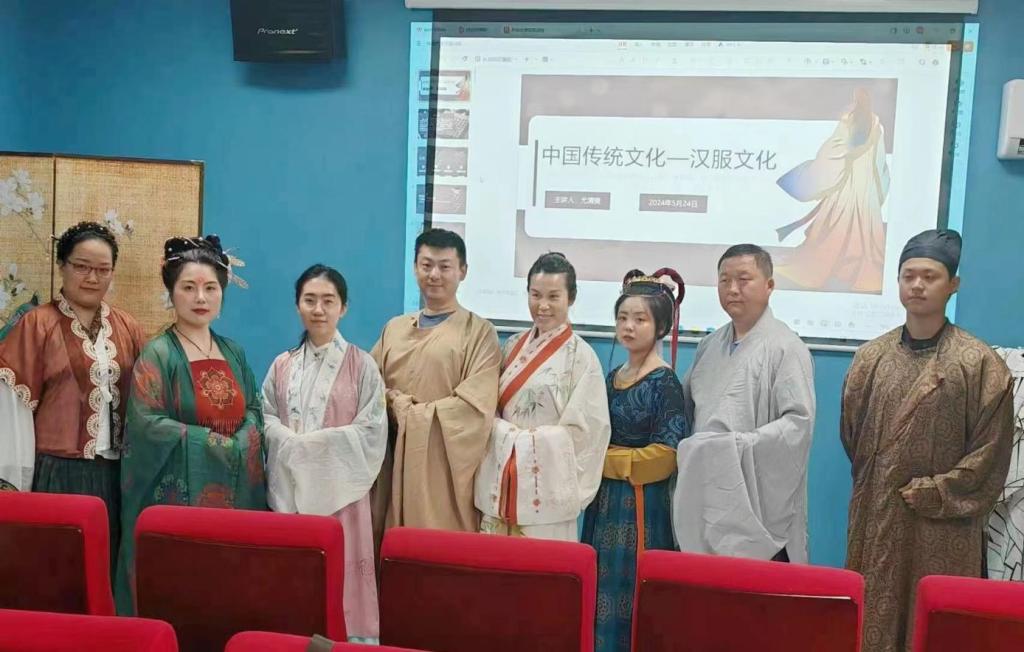 5月24日下午,文化沙龍室迎來了第一次講座《中國傳統文化——漢服文化》。《左傳》有言:“中國有禮儀之大,故稱夏;有服章之美,謂之華”,漢服作為華夏禮儀的重要組成部分,是從“黃帝堯舜禹垂衣裳而天下治”發展而來。講座邀請了傳統文化國學講師從漢服發展、結構配件、文化內涵、地位影響這四個方面進行了精彩且詳盡的闡釋,對歷代的漢服附以圖片和實物展示,邀請學員現場進行試穿,直觀的感受漢服這首絕美的詩,體會蘊藏其中的古典、含蓄、輕盈、飄逸之美。