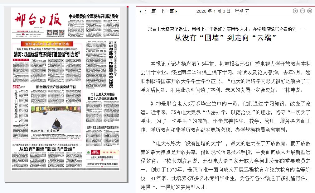 2020年1月3日,《邢臺(tái)日?qǐng)?bào)》頭版刊發(fā)通訊《從沒有“圍墻”到走向“云端”——邢臺(tái)電大培育留得住、用得上、干得好的實(shí)用型人才,辦學(xué)規(guī)模穩(wěn)居全省前列》,報(bào)道邢臺(tái)電大辦學(xué)40年的發(fā)展成就。全文如下: