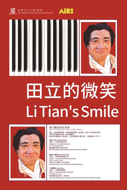 田立,香港中文大學(xué)(深圳)第十五期駐校藝術(shù)家,男高音,中央歌劇院國(guó)家一級(jí)演員,畢業(yè)于中央音樂(lè)學(xué)院,師從聲樂(lè)教育家沈湘、吳天球教授。曾主演中國(guó)歌劇《白毛女》、意大利歌劇《圖蘭朵》、《游吟詩(shī)人》、法國(guó)歌劇《卡門(mén)》。